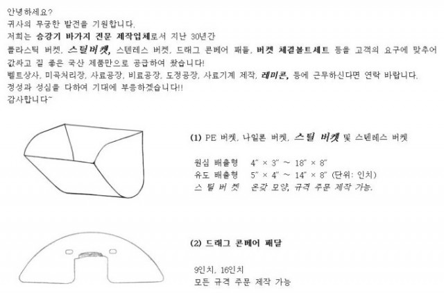 올버켓의 취급품목_PE버켓, 철버켓, 스틸버켓, 드래그콘베어패들, 패달, 버켓체결용 볼트세트, 로라, 바가지, 쇠바가지